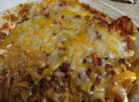Take your cream cheese mixture and pour on top of the noodles. Spread well over noodles.