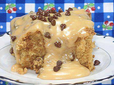 To make the frosting, warm the peanut butter and honey in the microwave then add the rest of the ingredients and beat to smooth. Spread over the hot cake and sprinkle with 1 cup of mini chocolate chips.