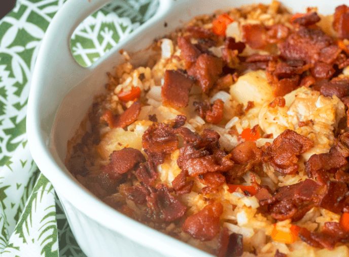 As this bakes in the oven, our kitchen is filled with a warm and inviting aroma. We love the combination of savory soy sauce, sweet honey and pineapple, al dente rice and tender chicken. Colorful food is so appealing, and that’s why we love to use bell peppers and green onion, for both flavor and looks. When we can’t escape off to a tropical island paradise, we can at least try to bring some of that island life home with us, and our Aloha chicken and rice is just what we need to bring the taste of vacation to a weeknight meal.