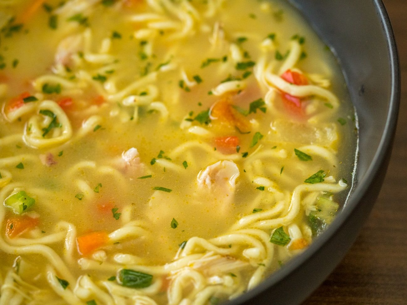- Pour in chicken broth and bring to a boil, then reduce to a simmer and stir in coconut milk, chicken, cilantro, green onions and ramen noodles.