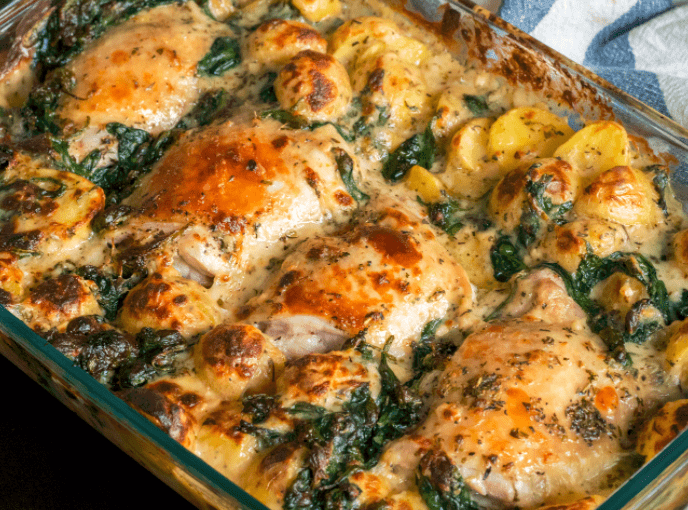 There’s nothing better than pulling a piping hot baking dish out of the oven that’s filled to the brim with a delicious, filling dinner to warm you up. One that’s got you covered regarding proteins, veggies and starches, so that all you have to do is put it on the table and scoop it onto your plate and you’re set. This baked chicken dish might at first seem simple, but don’t be so quick to judge; it’s chock-full of spinach and potatoes, and topped off with a decadently creamy, herbed garlic parmesan sauce that bumps the whole dish up several notches – and if you sneak a couple spoonfuls of the sauce while no one’s looking, no one will be the wiser!