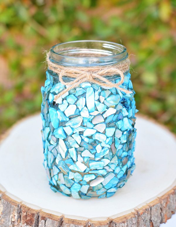 To make the jars apply a generous amount of decoupage glue on the mason jar, working in sections. Allow glue to fully dry before turning to another section or else the rocks will slide off. It takes about 20-30 minutes for each side to dry. Another tip is to make sure you have a single layer of the shells so that they adhere to the jar well.