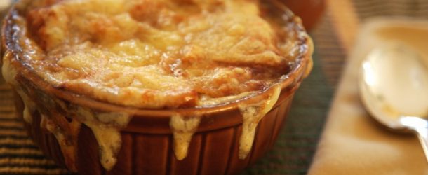 7. Ladle soup into oven-safe crock, top with toast, then 2 slices of swiss cheese.