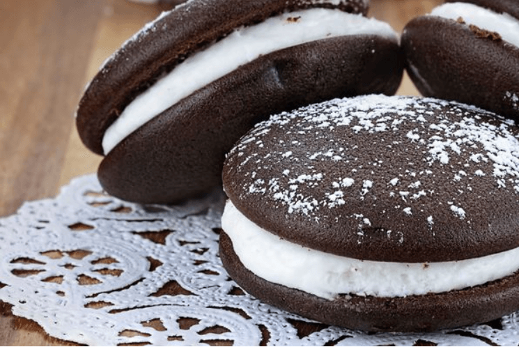 Once whoopee pies are completely cool, spoon filling (1-2 tablespoons) onto flat side of cake and top with second cake to create a little sandwich.