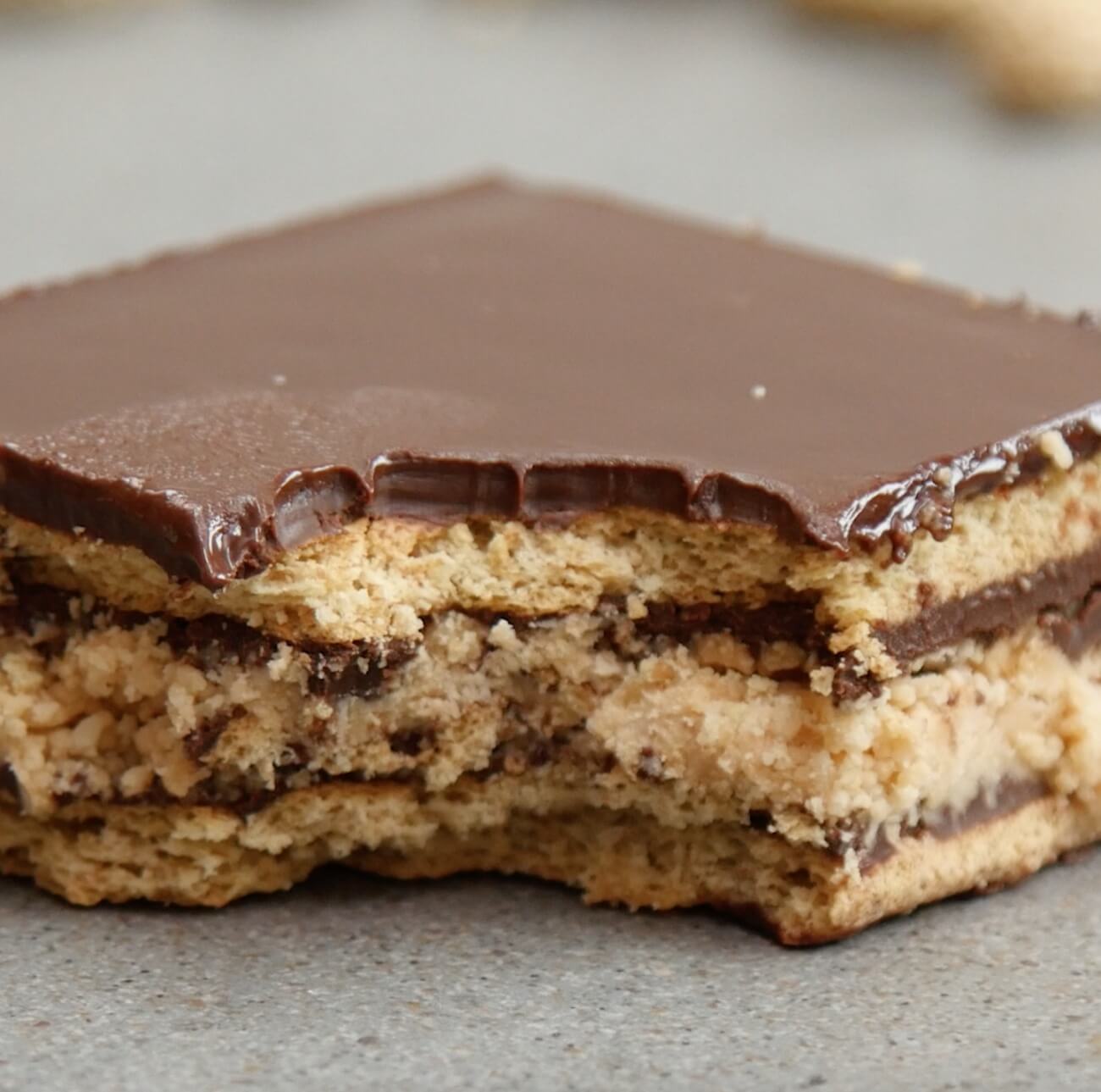 Top the peanut butter layer with another third of the melted chocolate, again evenly spreading it out, then with another layer of the graham crackers, followed by the remaining chocolate..