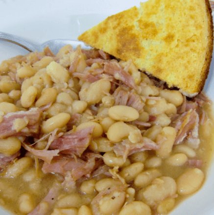 This is the last recipe from our Christmas ham. I always look forward to finishing off the ham with a nice big bowl of white beans and slice of cornbread. This recipe is super simple. It uses a pound of dried beans and simmers all day in the crockpot with a big ham bone. The Honey Baked Ham store sells ham bones year round (found that out on twitter). If you don’t have ham bone, use some ham shanks, ham hocks or just some chopped up ham. I love the creaminess of white beans combined with the saltiness of the ham. This is comfort food at its best!