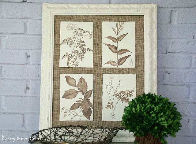 We created this easy DIY wall art using an old thrift store frame, leftover burlap and free prints from the internet.