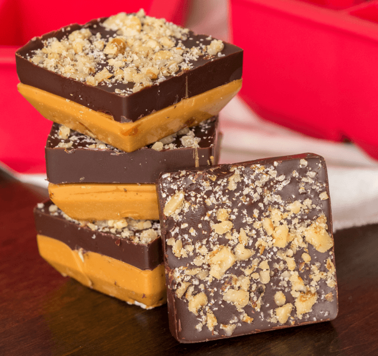 Starting out with a layer of chopped almonds, we then made an easy toffee by whisking together butter and sugar over medium-high heat for five to seven minutes; the mixture goes from being a light beige color to being a rich almond color, which is when you know you’ve cooked it perfectly. The vanilla extract and salt go into the mix, then you pour everything over your layer of almonds. Melt a layer of chocolate and pour that on top and you’re in business! One of our favorite elements of this dish are the large-and-in-charge silicone ice cube trays we used as a mold for our toffee. They’re the perfect size for this candy, allowing everyone a big enough piece so they feel like they’re getting an actual dessert and not just a tiny bite of dessert – we’re obsessed and pretty sure you will be too!