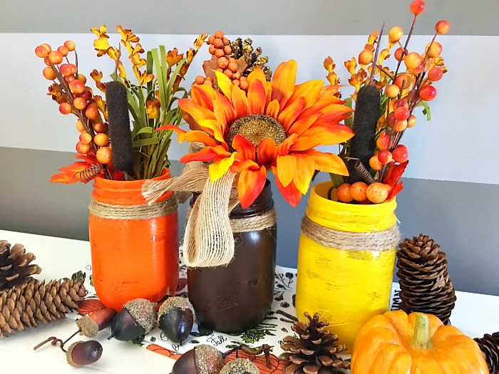 What are your favorite Mason jar craft ideas for fall décor? Let this beautiful fall Mason jar centerpiece inspire you. Simply paint three Mason jars with vibrant fall colors, add twine and fall flowers to create this stunning DIY fall décor.
