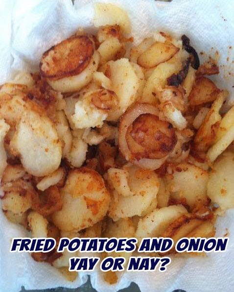 When the oil is ready (shimmery) put the potato and the onion into the oil.  Do not crowd the potatoes.  If there isn’t enough room for them to lay side by side, then let some cook, remove them to drain on a paper towel and then cook the rest.
