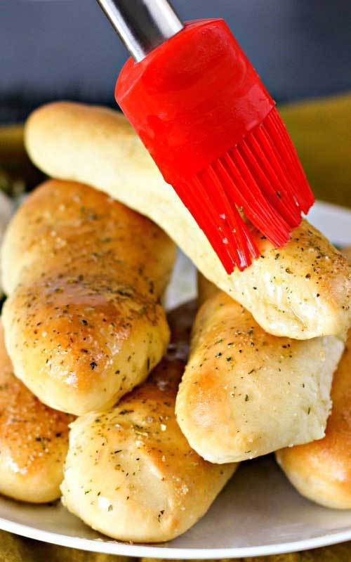 6. While breadsticks are baking, combine all the brushing ingredients in a small bowl. Remove the breadsticks from the oven and immediately brush with the butter mixture. Serve them while warm.