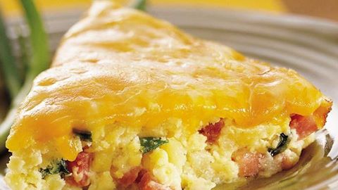 Sprinkle ham, pineapple and onions in pie plate. In medium bowl, stir Bisquick mix, milk, eggs and mustard until blended; pour over ham mixture.