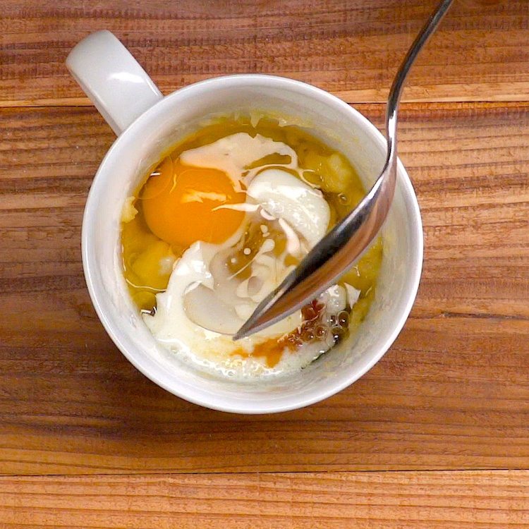 - In a large, microwave-safe coffee mug, mash your ripe banana. Add the egg, buttermilk, vanilla extract, oil, flour, brown sugar, baking powder, salt, and cinnamon (if using). Mix to combine.