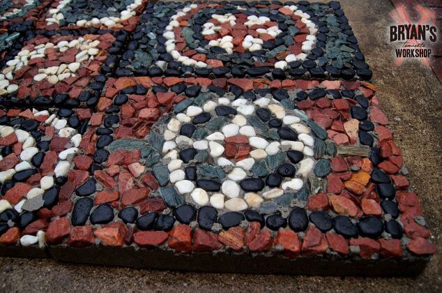 I did five practice pavers first and experimented with different brands of mortar, cement and rock placement. I didn’t want any of the rocks coming loose or pavers breaking in half in the future. The two large pavers and the small curly one are made out of what I think works best.