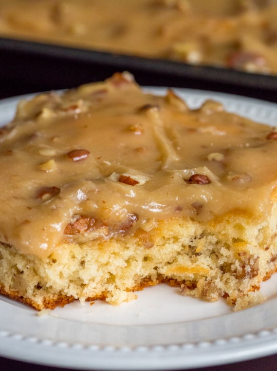 For all you nut lovers out there, there’s one flavor combination that we think just does not get the attention it deserves. It’s salty and sweet and perfectly delicious, so why don’t more people realize how great butter pecan treats are?? Don’t worry, we’re here to give it the love it deserves and to convince previously-non-butter-pecan-lovers that it is truly amazing. The way we’re going to do that today is with this butter pecan sheet cake.