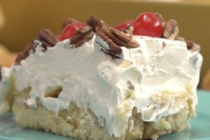 Cut each pineapple slice into3 pieces; set aside. In large bowl, beat cake mix, milk and eggs with electric mixer on low speed 30 seconds. Beat on medium speed 2 minutes, scraping bowl occasionally.