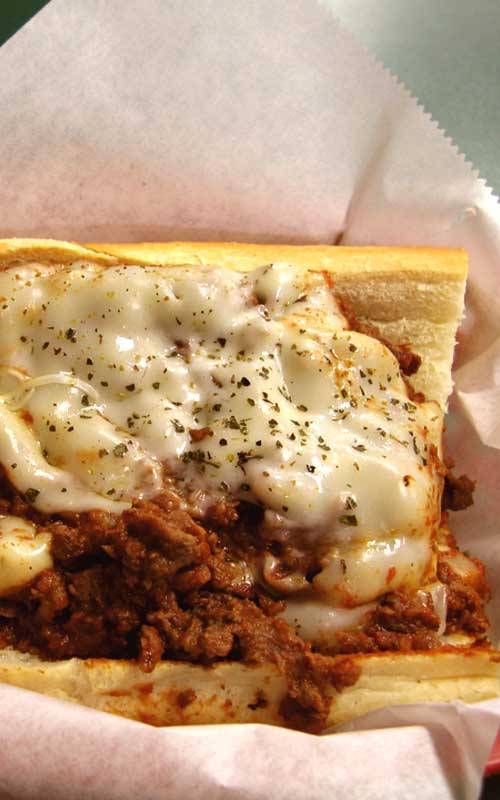 Massive, messy, AND delicious! You will love this pizza steak sub loaded with thinly sliced prime rib, sauteed onions and peppers, and covered in pasta sauce and gooey, melted mozzarella cheese.