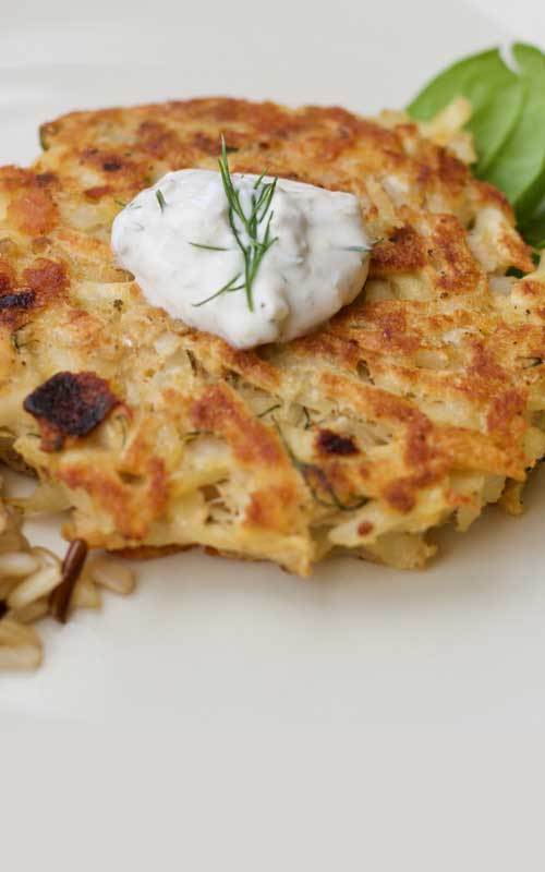 Frozen hash browns and flaked salmon come together for a twist on this traditional Swiss favorite, Salmon Rosti. We love the creamy dill sauce, but a little bit of ketchup is tasty too!