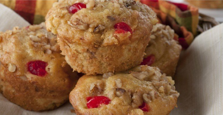 Stir in banana, 1/2 cup walnuts, and 1/4 cup cherries; mix well then pour into prepared muffin cups. Sprinkle with remaining nuts and cherries.