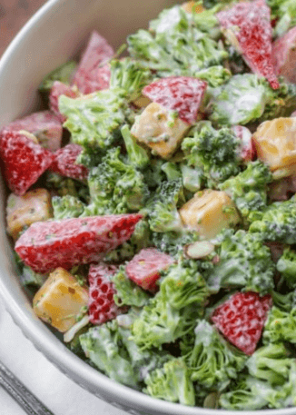 Today’s Strawberry Broccoli Salad was a breeze to throw together and is perfect for the summer. In all honestly, I did try a few strawberries and cheese chunks, and can attest to the delicious dressing each piece is coated with. If you’re a normal person and like broccoli, my sources tell me that you should definitely try this recipe. I will admit that I do love asparagus and may try that instead of broccoli next time. I think it would be great with the cheese, strawberries and delicious dressing. Give this broccoli salad recipe a go yourself and let me know what you think. Our family loved it and has already made plans to make it again!