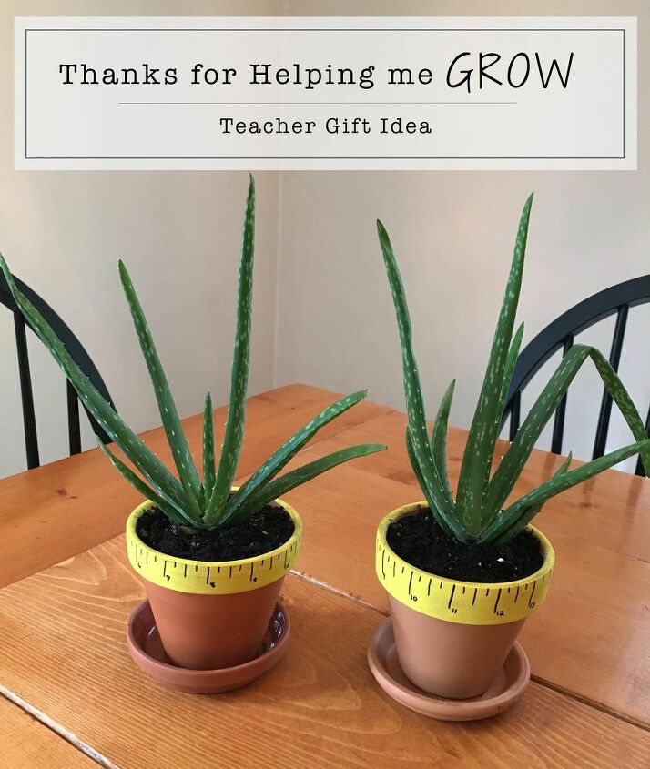 Teacher gift ideas are always tough… I always want to do something thoughtful, useful, but still affordable. This year we decided to make ruler painted flower pots to go with the “Thanks for helping me GROW” theme. In them we planted small aloe vera plants which will come in handy for soothing sunburns over summer vacation. | This post contains affiliate links |