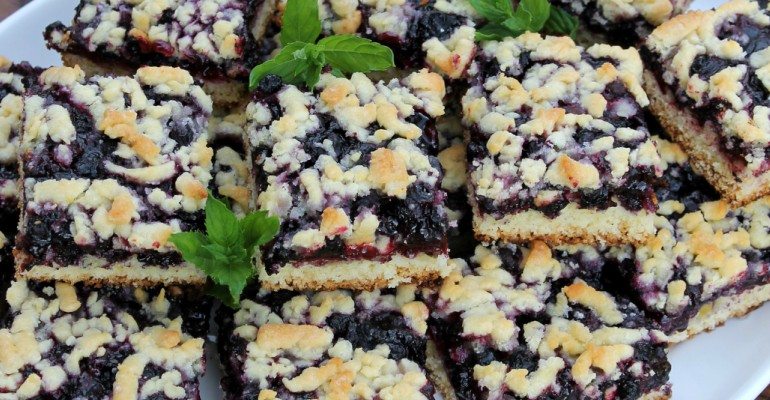 In another bowl, stir together the sugar, cornstarch and lemon juice. Gently mix in the blueberries. Sprinkle the blueberry mixture evenly over the crust. Crumble remaining dough over the berry layer.